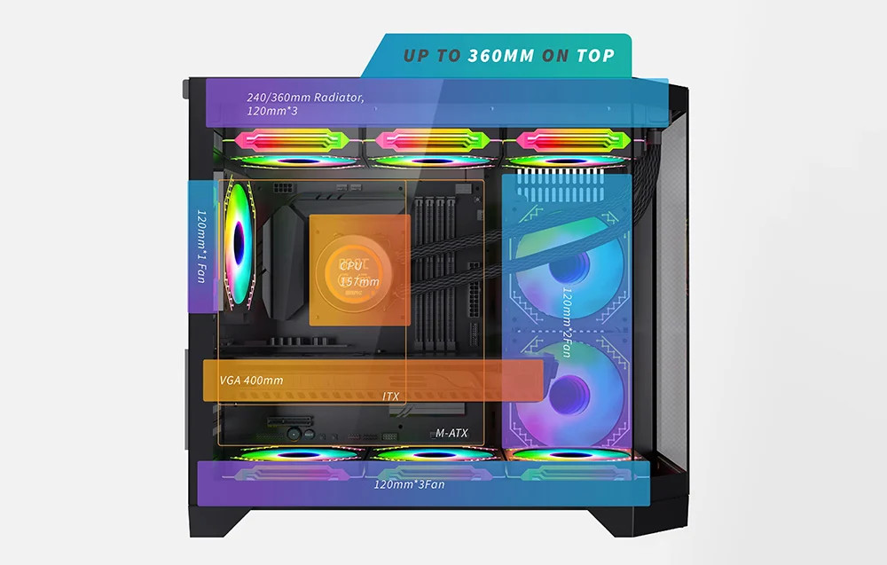 Ventilátorok rögzítési lehetőségei Felül: 3x 120 mm-es ventilátor; Hátul: 1x 120 mm-es ventilátor;