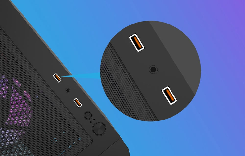 Előlapi csatlakozók USB 3.0 x2, fejhallgató/hangszóró kimenet, tápellátás, visszaállítás