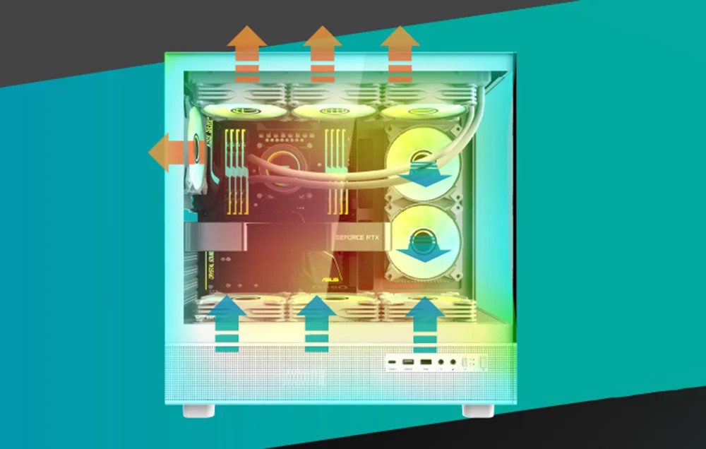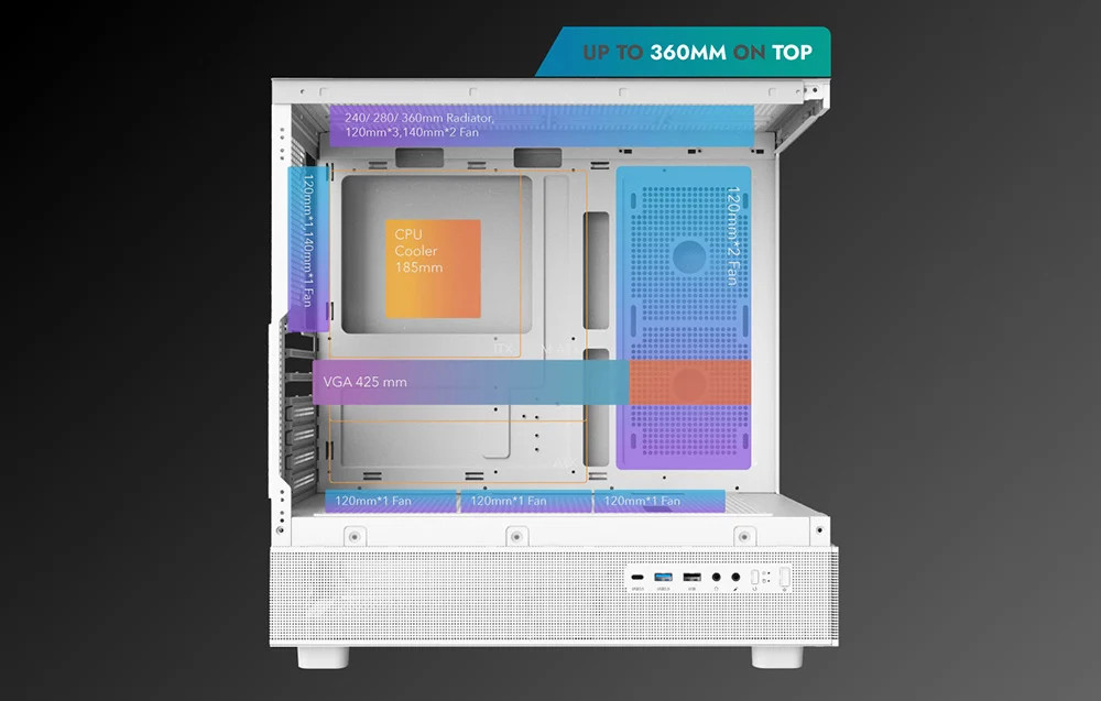 Ventilátorok felszerelési lehetőségei Felül: 3x 120 mm-es ventilátor / 2x 140 mm-es ventilátor; Oldalt: 2x 120 mm-es ventilátor; Hátul: 1x 120 mm-es ventilátor / 1x 140 mm-es ventilátor; Alul: 3x 120 mm-es ventilátor;