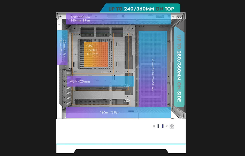 Ventilátorok rögzítési lehetőségei Felül: 3 x 120 mm or 3 x 140 mm; Hátul: 1 x 120 mm vagy 1 x 140 mm; Oldalt: 3 x 120 mm vagy 3 x 140 mm; Tápegységrekesz: 3 x 120 mm vagy 3 x 140 mm: 3 x 120 mm