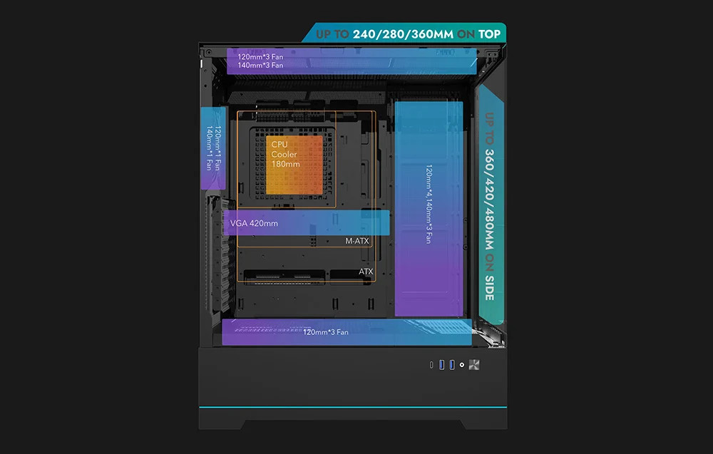 Ventilátorok rögzítési lehetőségei Hátul: 1 x 120 mm vagy 1 x 140 mm; Oldalt: 4 x 120 mm vagy 3 x 140 mm; PSU rekesz: 3 x 120 mm