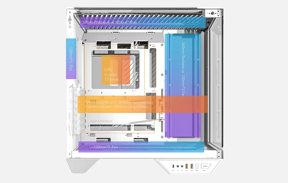 Vízhűtés felszerelési lehetőségek Hátul: 120 mm-es vízhűtés; Felül: 360 mm-es vízhűtés; Oldalt: 360 mm-es vízhűtés;