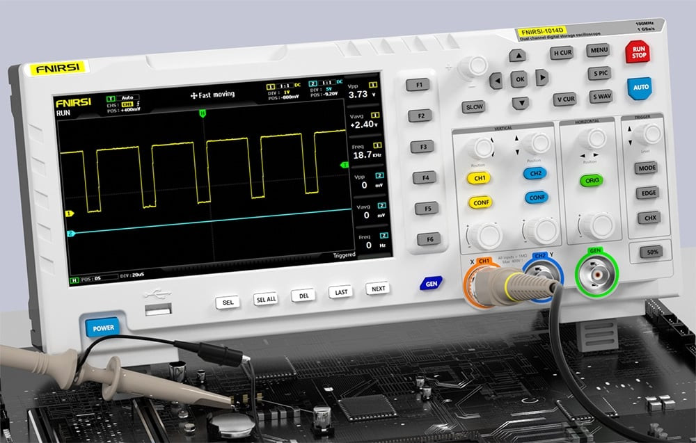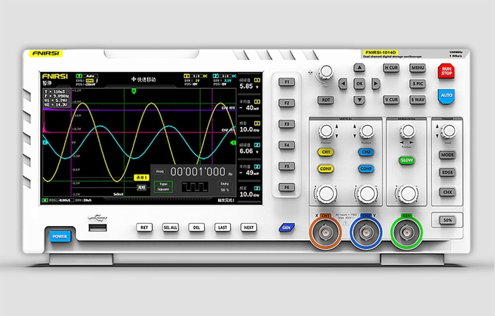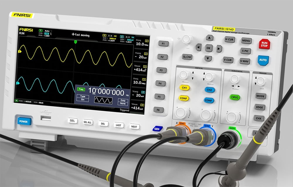 Az FNIRSI 1014D egy kompakt digitális oszcilloszkóp, amelyet elektronikus szervizek, kutatási és fejlesztési részlegek, műszaki oktatás és hobbisták számára terveztek. Lehetővé teszi az egyidejű elemzést és jelgenerálást, ami jelentősen megnöveli az alkalmazási lehetőségeket áramkörök diagnosztizálásakor, prototípusok tesztelésekor vagy a hullámformákkal való munka megtanulásakor. A készülék két bemeneti csatornával rendelkezik 1 MΩ impedanciával, és 100 MHz sávszélességet támogat 1GSa/s mintavételezés mellett. A kezelést egy 7 hüvelykes, 800×480 px felbontású LCD-képernyő könnyíti meg. Lehetőség van automatikus elemzésre, FFT, X-Y módra és kurzoros felvételre. A készülék 1 GB-os belső memóriával rendelkezik, amely akár 1000 hullámforma és 1000 képernyőkép tárolására is alkalmas, és az adatok USB-n keresztül könnyen exportálhatók számítógépre.