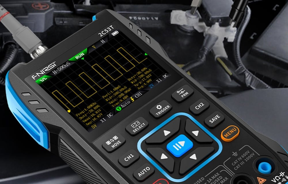 Az FNIRSI 2C53T egyesíti a 2×50 MHz/250 MSa/s oszcilloszkóp funkcióit 8 bites ADC-vel és csatornánként 16 kpct memóriapufferrel (pre/post-trigger), 19999 számláló multiméterrel és 50 kHz-es jelgenerátorral. A bemeneti impedancia 1 MΩ ∥ 15 pF AC/DC/GND kapcsolással. A robusztus ABS ház szilikon borítással, a 2,8 hüvelykes 320×240 px képernyő és a 3000 mAh-s akkumulátor (akár 4 órás üzemidő) garantálja a mobilitást és a folyamatos méréseket még zord környezetben is. A készülék CAT II 300 V-os tanúsítvánnyal, kettős kerámia biztosítékkal és égésgátló áramkörrel rendelkezik. A hullámformák mentésének és a firmware frissítésének lehetőségével mindig kézben tarthatja eredményeit, és hozzáférhet a legújabb funkciókhoz.