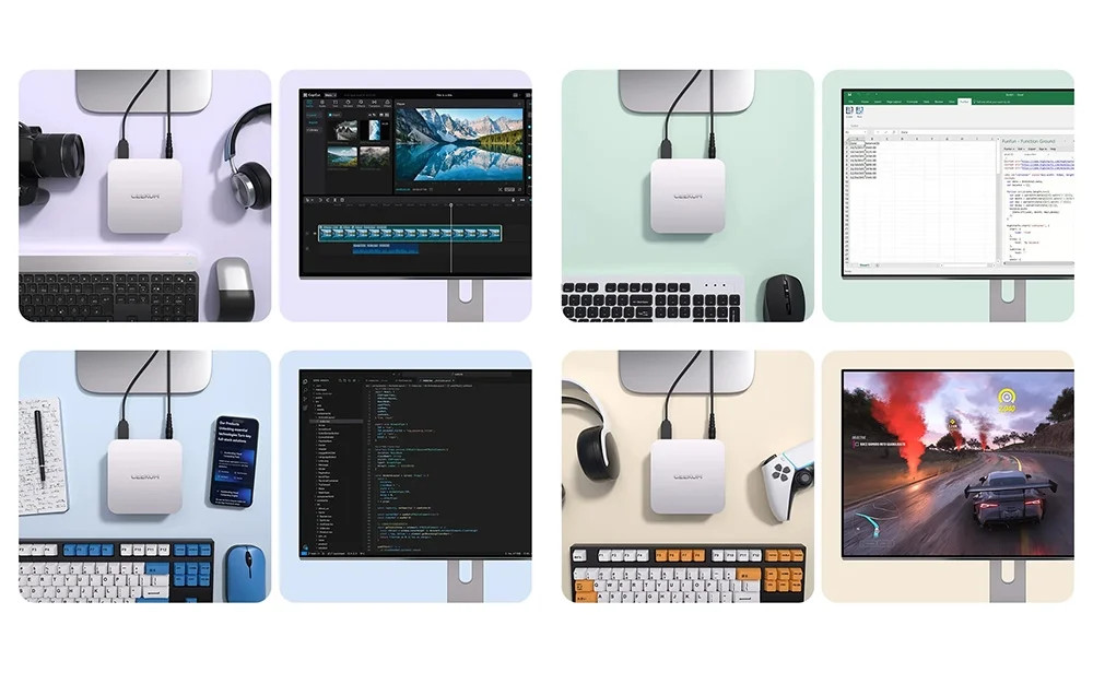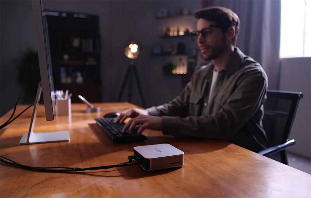 A mini PC kialakítása lehetővé teszi több eszköz egyidejű csatlakoztatását. A 2 HDMI 2.0 port és a 2 USB-C port akár 4 monitort is támogat 4K minőségben. Az USB 4.0 Gen 3 port nagy sebességű adatátvitelt és a csatlakoztatott eszközök tápellátását biztosítja. A további USB 3.2 és USB 2.0 portok lehetővé teszik a különböző kiegészítőkkel való munkát, az SD-kártyaolvasó pedig megkönnyíti a fájlok átvitelét fényképezőgépekről és videokamerákról.