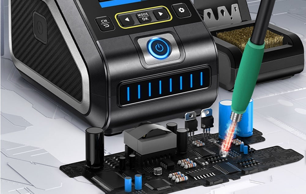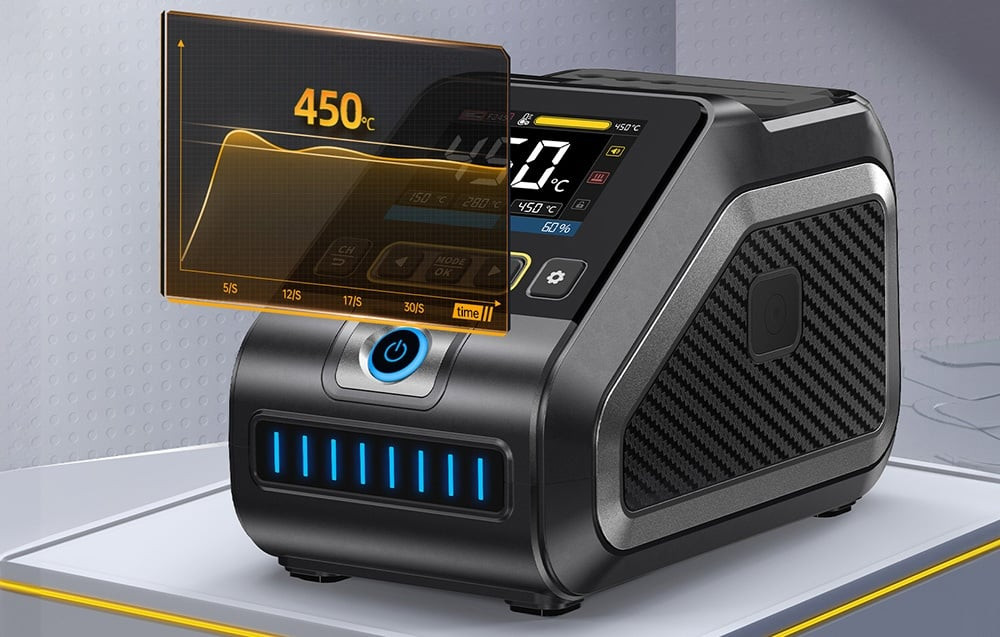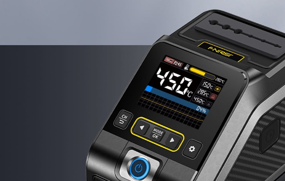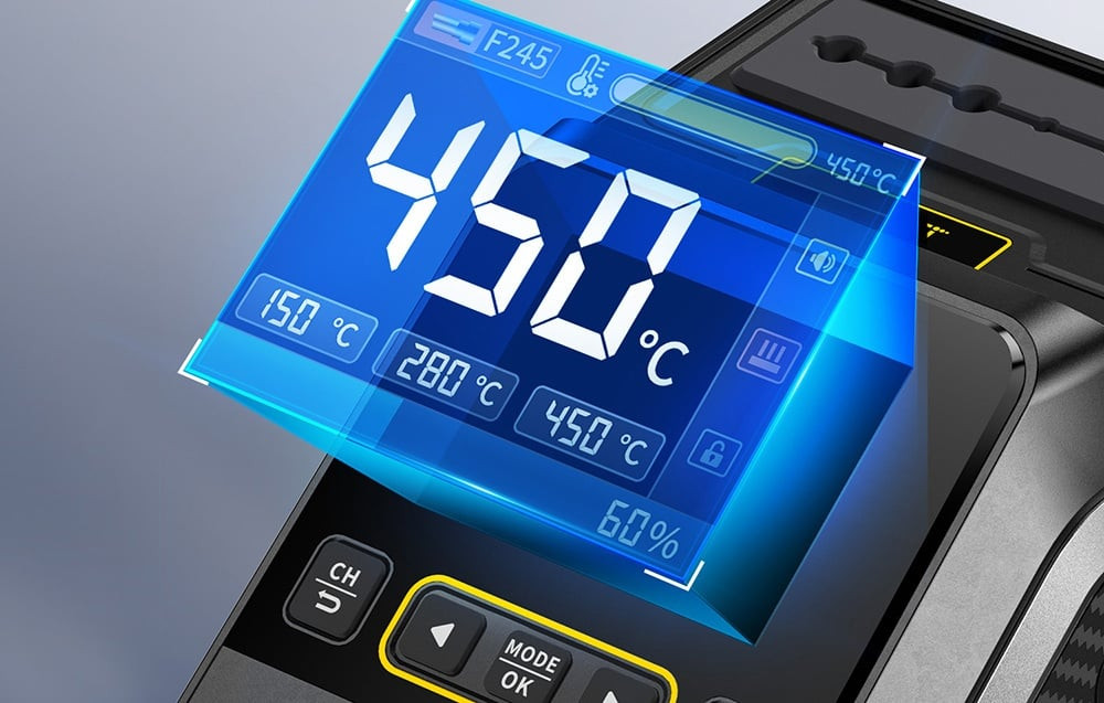 Az állomás támogatja az F210 és F245 tartókat is - könnyedén válthat közöttük az adott munkától függően. A széles feszültségtartománynak (100-240V) és a tiszta réz transzformátornak köszönhetően az egység stabilan működik a legkülönbözőbb áramellátási körülmények között, így ideális választás a felhasználók számára világszerte. Az intelligens PID-rendszer stabil hőmérséklet-szabályozást tesz lehetővé 100°C és 450°C között. Az állomás gyors fűtési (mindössze 1 másodperc) és olvadási (3 másodperc) idővel is rendelkezik, emellett akár 200 W-os teljesítményt kínál a még pontosabb működés érdekében.