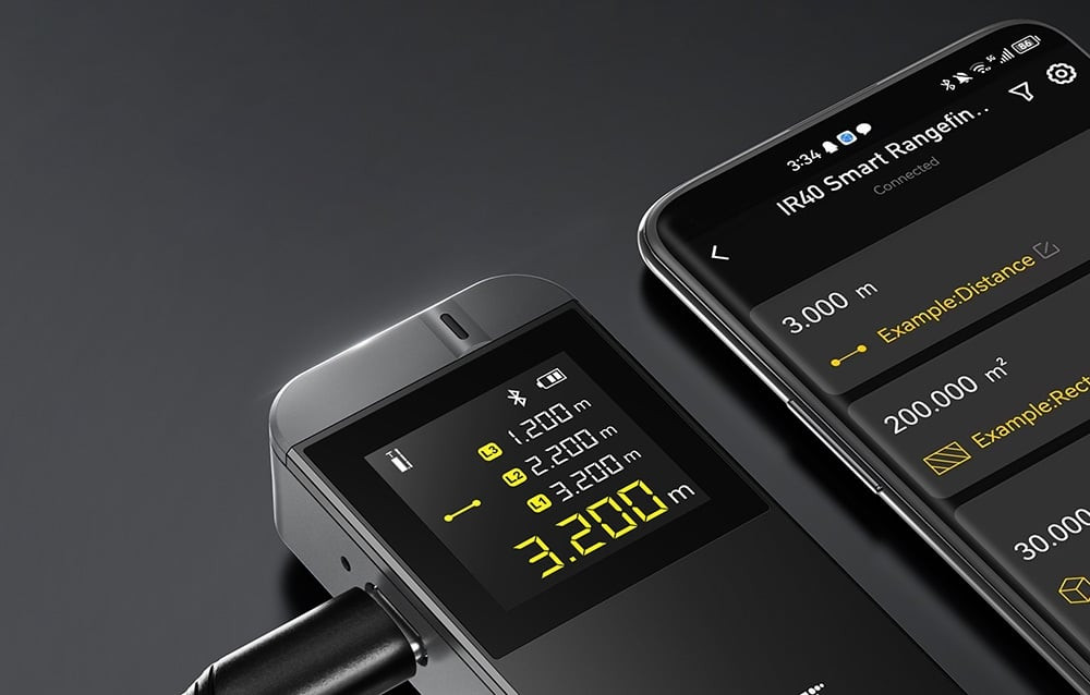 A kompakt (19 x 34,5 x 79 mm), kellemesen ívelt kialakítású tokban egy 400 mAh lítium akkumulátor kapott helyet. A készülék USB-C porton keresztül tölthető, és egy teljes töltés akár 3000 méréshez is elegendő. Ez biztosítja, hogy az eszköz mindig munkára kész legyen, és évekig kitartson. A kettős fogantyú kialakítása és az egy kattintással történő mérésindítás gyors és kényelmes használatot tesz lehetővé az FNIRSI IR40 használatával - ideális még dinamikus munkakörülmények között is. Csatlakoztassa a távolságmérő készüléket egy erre a célra szolgáló Android vagy iOS alkalmazáshoz, hogy elfelejthesse a kézi jegyzetelést. Szinkronizálja a valós idejű adatokat, adjon hozzá megjegyzéseket, rajzoljon alaprajzokat, számítsa ki a hosszúságot, a területet és a térfogatot - mindez okostelefonjáról elérhető.