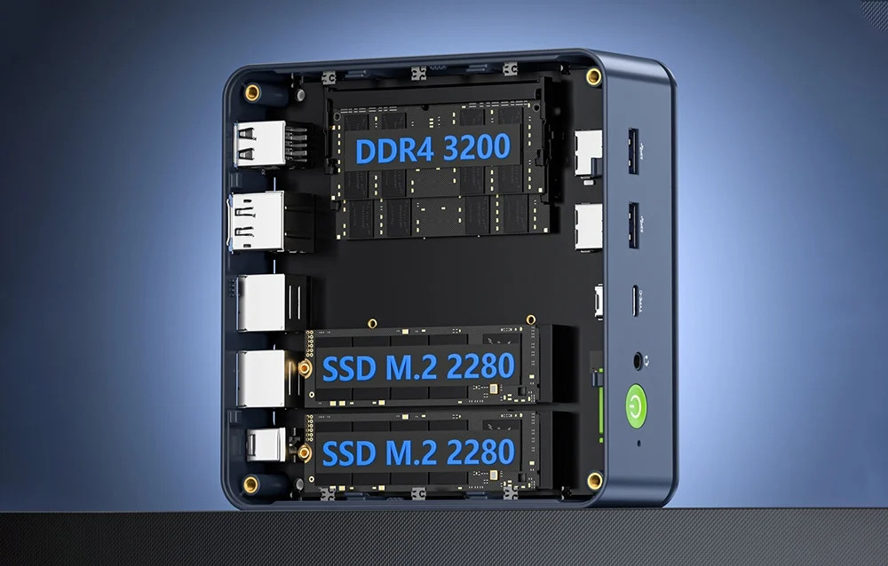 A számítógép okos kialakításának köszönhetően az M5 PLUS komponensek telepítése és bővítése gyors és intuitív. A bővíthető RAM, amely DDR4 3200 technológiával működik kétcsatornás konfigurációban, lehetővé teszi a hardver teljes körű testreszabását. Emellett a kettős M.2 2280 SSD-helyhez való hozzáférés lehetővé teszi, hogy akár 2 TB összkapacitású meghajtókat telepítsen, ami villámgyors adatelérést és PCle Gen 3.0-n akár 3500 MB/s-os csúcs olvasási sebességet garantál. Ezáltal az M5 PLUS alkalmazkodik az Ön igényeihez, legyen szó akár irodai munkáról, prezentációról vagy multimédiás böngészésről.